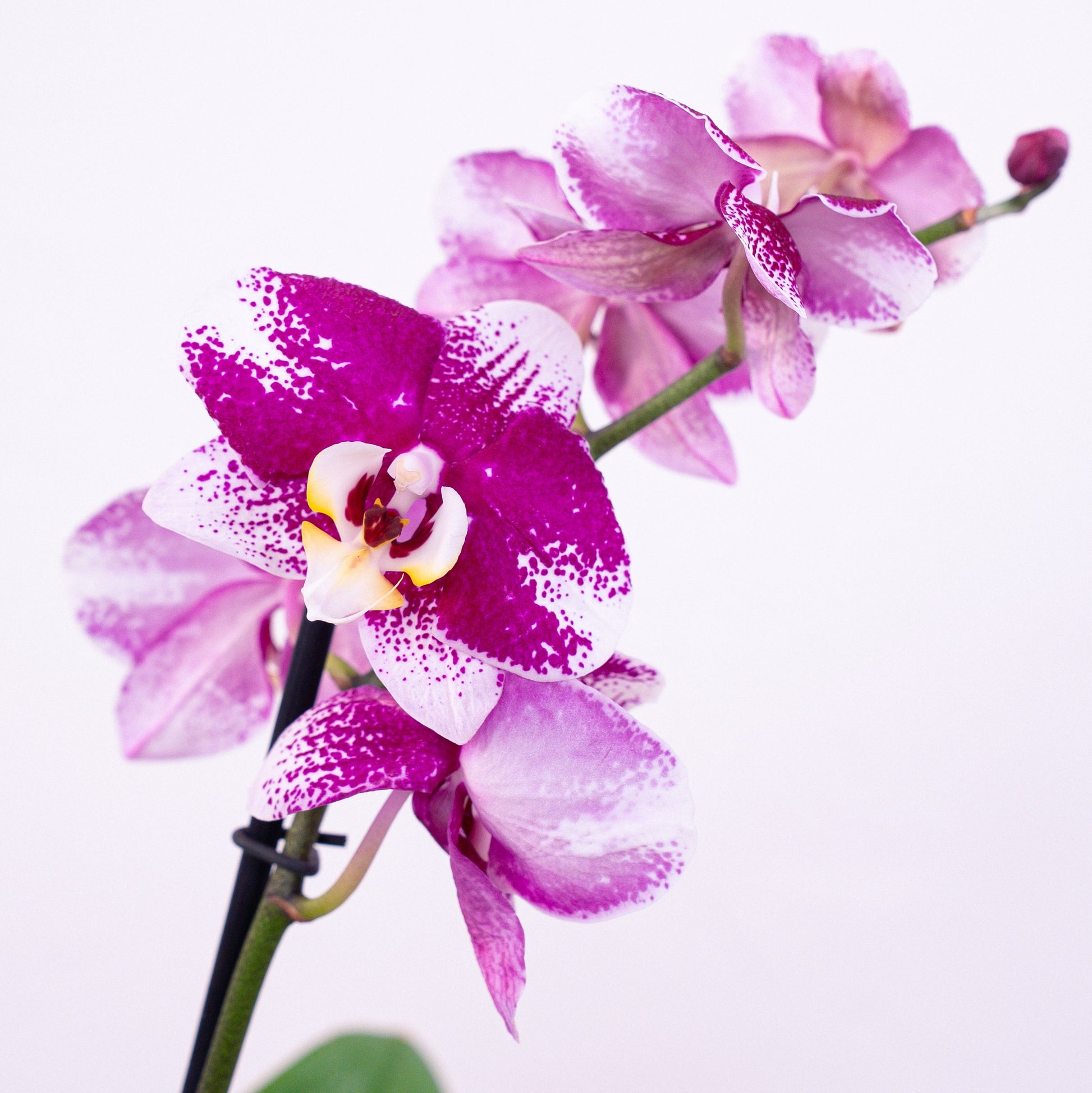 Canasto de mimbre con cuarzo rosa árbol de la vida, con una Orquídea Phalanopsis en base de cerámica blanca. Para esa madre que prioriza la paz y la tranquilidad en su vida.